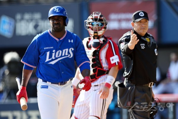 9일 서울 잠실야구장에서 ‘2023 신한은행 SOL KBO리그’ LG 트윈스와 삼성 라이온즈의 경기가 열렸다. 7회초 1사 만루에서 삼성 피렐라가 삼진 아웃으로 물러나며 아쉬워하고 있다.