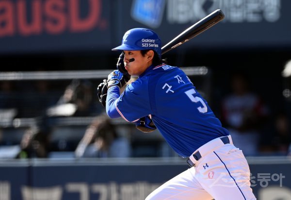 9일 서울 잠실야구장에서 ‘2023 신한은행 SOL KBO리그’ LG 트윈스와 삼성 라이온즈의 경기가 열렸다. 7회초 1사 2루에서 삼성 구자욱이 안타를 날리고 있다.