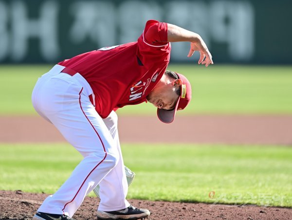 9일 대전 한화생명이글스파크에서 열린 ‘2023 신한은행 SOL KBO리그’ 한화 이글스와 SSG 랜더스의 경기에서 9회말 무실점으로 경기를 끝낸 SSG 노경은이 기뻐하고 있다.