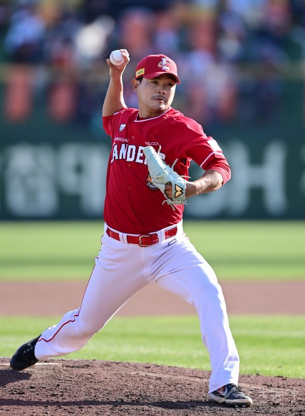 9일 대전 한화생명이글스파크에서 열린 ‘2023 신한은행 SOL KBO리그’ 한화 이글스와 SSG 랜더스의 경기에서 9회말 SSG 노경은이 교체로 마운드에 올라 역투하고 있다.