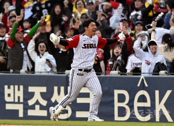 9일 서울 잠실야구장에서 ‘2023 신한은행 SOL KBO리그’ LG 트윈스와 삼성 라이온즈의 경기가 열렸다. 연장 10회말 2사 1, 2루에서 LG 문보경이 끝내기 안타를 날린 후 환호하고 있다.