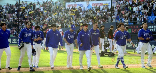 9일 서울 잠실야구장에서 ‘2023 신한은행 SOL KBO리그’ LG 트윈스와 삼성 라이온즈의 경기가 열렸다. 삼성이 연장 10회말 끝내기를 허용하며 스윕패를 당한 후 선수들이 그라운드를 빠져나가고 있다.