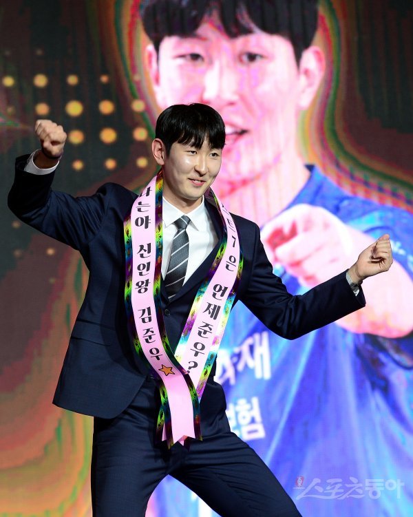 10일 서울 용산구 그랜드하얏트 서울에서 ‘2022-2023 도드람 V리그’ 시상식이 열렸다. 삼성화재 김준우가 남자부 신인선수상을 수상 후 세리머니를 펼치고 있다.