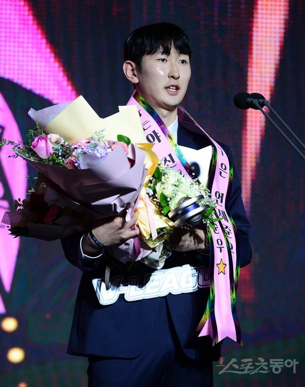 10일 서울 용산구 그랜드하얏트 서울에서 ‘2022-2023 도드람 V리그’ 시상식이 열렸다. 삼성화재 김준우가 남자부 신인선수상을 수상 후 소감을 밝히고 있다.