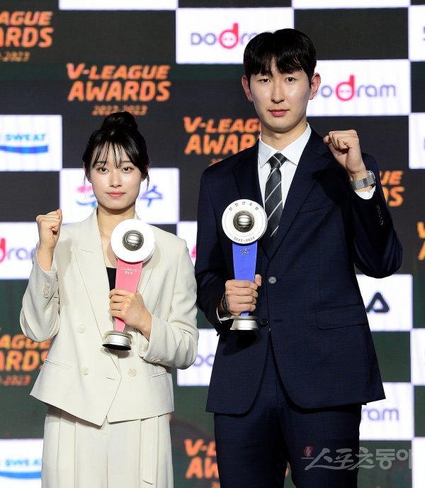 10일 서울 용산구 그랜드하얏트 서울에서 ‘2022-2023 도드람 V리그’ 시상식이 열렸다. 신인선수상을 수상한 KGC인삼공사 최효서와 삼성화재 김준우가 기념촬영을 하고 있다.