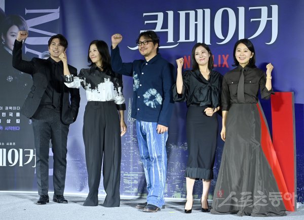 배우 류수영, 서이숙, 오진석 감독, 문소리, 김희애가 11일 서울 용산 아이파크몰 CGV에서 진행된 넷플릭스 시리즈 ‘퀸메이커’ 제작발표회에서 포토타임을 갖고 있다.