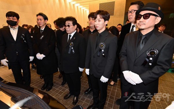 고 현미의 발인식이 11일 서울 동작구 흑석동 중앙대학교병원 장례식장에서 엄수됐다. 가수 박상민을 비롯한 동료 가수들이 묵념을 하고 있다.