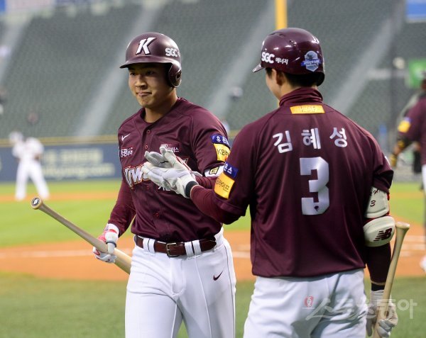 11일 서울 잠실야구장에서 ‘2023 신한은행 SOL KBO리그’ 키움 히어로즈와 두사 베어스 경기가 열렸다. 2회초 2사 키움 김휘집이 좌월 솔로 홈런을 날리고 그라운드를 돌아 홈인해 하이파이브 하고 있다.