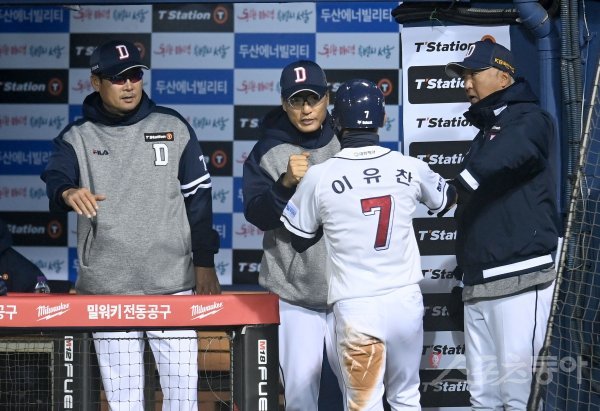 11일 서울 잠실야구장에서 ‘2023 신한은행 SOL KBO리그’ 키움 히어로즈와 두사 베어스 경기가 열렸다. 5회말 1사 3루 두산 안타 때 득점한 3루주자 이유찬이 이승엽 감독의 축하를 받고 있다.