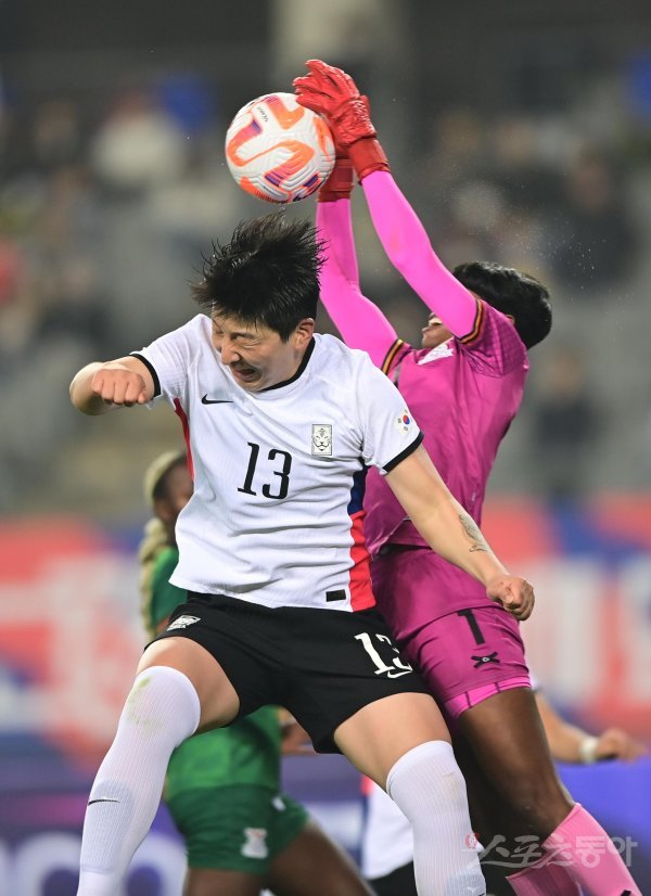 11일 경기도 용인미르스타디움에서 열린 신세계 이마트 초청 여자축구대표팀 친선경기 2차전 한국과 잠비아의 경기에서 한국 박은선이 헤딩 과정에서 잠비아 골키퍼와 충돌하고 있다.