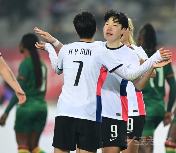 11일 경기도 용인미르스타디움에서 열린 신세계 이마트 초청 여자축구대표팀 친선경기 2차전 한국과 잠비아의 경기에서 한국 이금민이 페널티킥으로 해트트릭을 성공시킨 후 동료와 기쁨을 나누고 있다.
