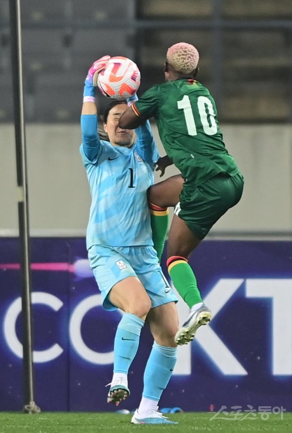 11일 경기도 용인미르스타디움에서 열린 신세계 이마트 초청 여자축구대표팀 친선경기 2차전 한국과 잠비아의 경기에서 한국 윤영글이 볼을 잡는 과정에서 잠비아 공격수와 충돌하고 있다.