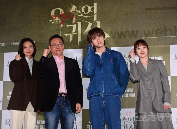 배우 신소율, 감독 정용기, 김재현, 김보라가 12일 서울 용산구 CGV 용산아이파크몰점에서 열린 영화 ‘옥수역귀신’ 언론시사회에서 포즈를 취하고 있다.