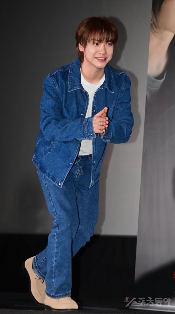 엔플라잉 김재현이 12일 서울 용산구 CGV 용산아이파크몰점에서 열린 영화 ‘옥수역귀신’ 언론시사회에서 무대에 오르고 있다.