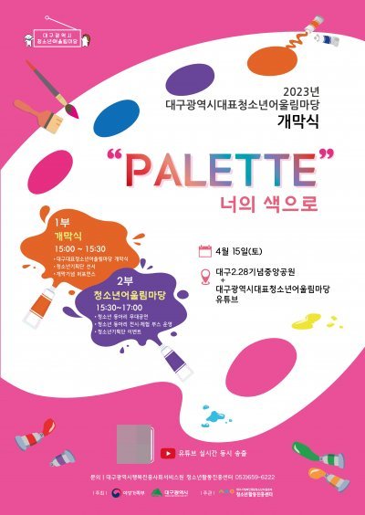 조경선 대구광역시 청년여성교육국장은 “청소년이 청소년 어울림마당을 통해 여가를 즐기고 문화예술 활동을 체험할 수 있길 바란다”라며 “앞으로도 건전한 청소년 문화조성을 위한 다양한 정책을 발굴해 지원하겠다”라고 말했다.