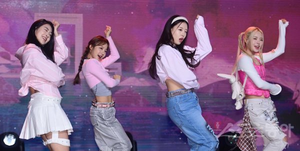 그룹 피프티 피프티가 13일 서울 강남구 청담동 일지아트홀에서 열린 기자간담회에서 빌보드 핫100에 진입한 ‘큐피드’ 무대를 펼치고 있다.