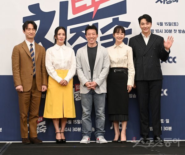 배우 김병철, 엄정화, 김대진 감독, 명세빈, 민우혁이 13일 서울 강남구 조선 팰리스 강남에서 열린 JTBC ‘닥터 차정숙’ 제작발표회에서 포토타임을 갖고 있다.