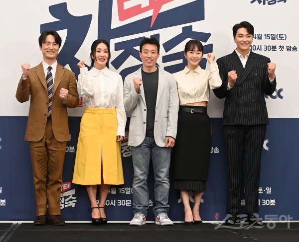 배우 김병철, 엄정화, 김대진 감독, 명세빈, 민우혁이 13일 서울 강남구 조선 팰리스 강남에서 열린 JTBC ‘닥터 차정숙’ 제작발표회에서 포토타임을 갖고 있다.