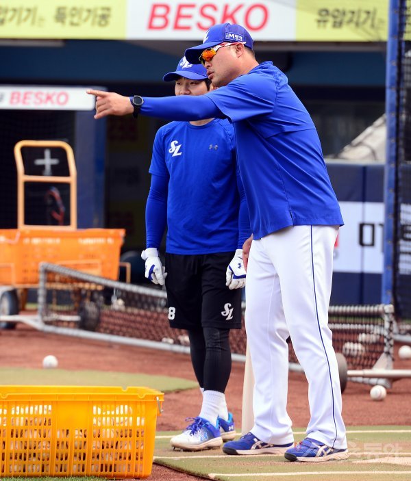 13일 대구 삼성라이온즈파크에서 ‘2023 신한은행 SOL KBO리그’ 삼성 라이온즈와 SSG 랜더스의 경기가 열린다. 경기 전 삼성 박한이 코치가 김지찬의 타격 훈련을 돕고 있다.
