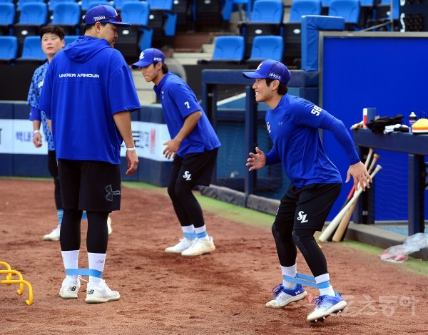 13일 대구 삼성라이온즈파크에서 ‘2023 신한은행 SOL KBO리그’ 삼성 라이온즈와 SSG 랜더스의 경기가 열린다. 경기 전 삼성 김지찬이 스트레칭 훈련을 하고 있다.