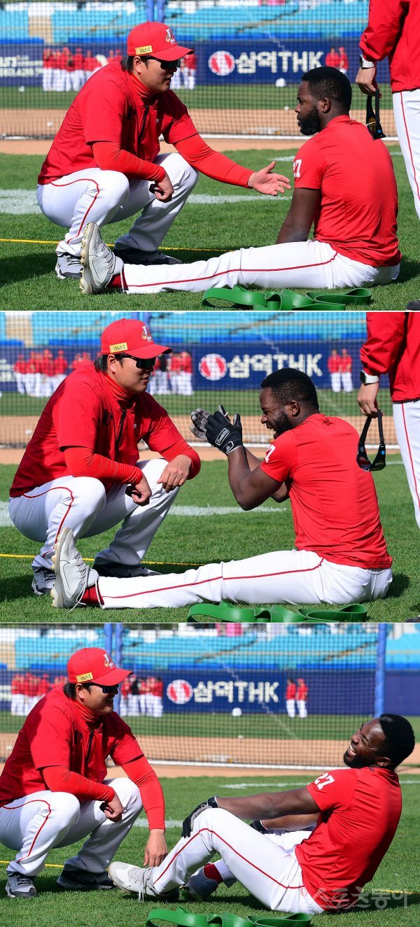 13일 대구 삼성라이온즈파크에서 ‘2023 신한은행 SOL KBO리그’ 삼성 라이온즈와 SSG 랜더스의 경기가 열린다. 경기 전 SSG 이진영 코치와 에레디아가 장난을 치고 있다.