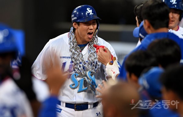13일 대구 삼성라이온즈파크에서 ‘2023 신한은행 SOL KBO리그’ 삼성 라이온즈와 SSG 랜더스의 경기가 열렸다. 1회말 1사 1, 2루에서 삼성 김동엽이 3점 홈런을 쏘아 올린 후 동료들의 환영을 받고 있다.