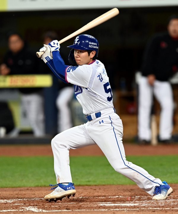 13일 대구 삼성라이온즈파크에서 ‘2023 신한은행 SOL KBO리그’ 삼성 라이온즈와 SSG 랜더스의 경기가 열렸다. 3회말 2사 1, 2루에서 삼성 김지찬이 안타를 날리고 있다.