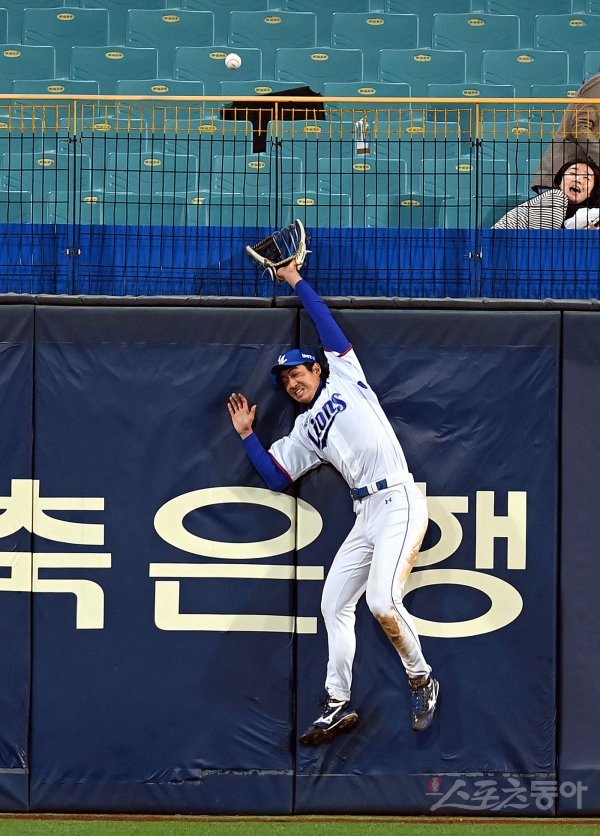 13일 대구 삼성라이온즈파크에서 ‘2023 신한은행 SOL KBO리그’ 삼성 라이온즈와 SSG 랜더스의 경기가 열렸다. 4회초 2사에서 삼성 구자욱이 홈런성 타구를 잡기 위해 선을 뻗었으나 공은 펜스를 맞고 있다.