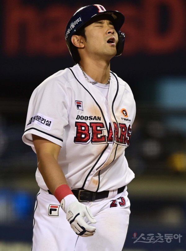 13일 서울 잠실야구장에서 열린 ‘2023 신한은행 SOL KBO리그’ 두산 베어스와 키움 히어로즈의 경기에서 7회말 1사 1, 2루 두산 강승호가 삼진 아웃을 당한 후 아쉬워하고 있다.