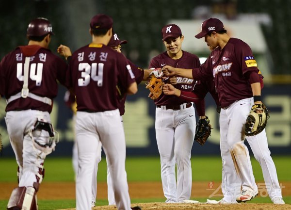 13일 서울 잠실야구장에서 열린 ‘2023 신한은행 SOL KBO리그’ 두산 베어스와 키움 히어로즈의 경기에서 9-1로 승리한 키움 선수들이 기쁨을 나누고 있다.