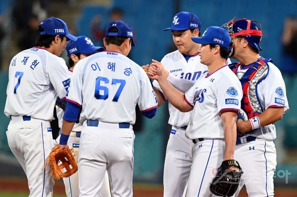 13일 대구 삼성라이온즈파크에서 ‘2023 신한은행 SOL KBO리그’ 삼성 라이온즈와 SSG 랜더스의 경기가 열렸다. 삼성이 SSG를 상대로11-9로 승리한 후 선수들이 그라운드에서 기쁨을 나누고 있다.