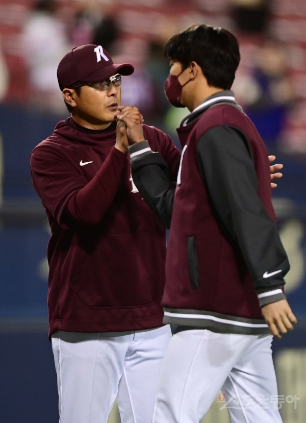 13일 서울 잠실야구장에서 열린 ‘2023 신한은행 SOL KBO리그’ 두산 베어스와 키움 히어로즈의 경기에서 9-1로 승리한 키움 홍원기 감독이 선수들과 기쁨을 나누고 있다.