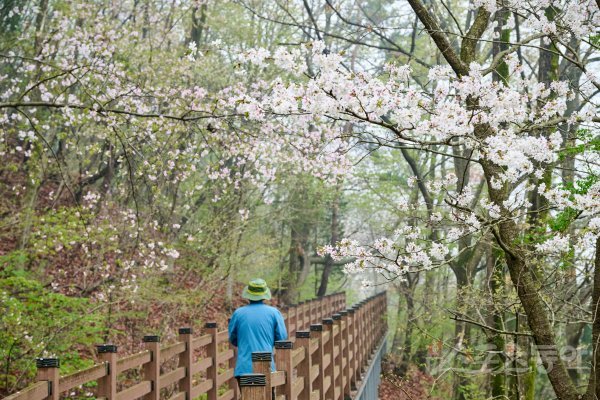 구이저수지 주위를 따라 조성한 8km의 둘레길. 봄비를 맞으며 촉촉해진 꽃잎과 뽀얀 물안개, 선명한 초록 색감의 신록이 어우러져 아련하고 환상적인 분위기를 자아낸다. 완주|김재범 oldfield@donga.com