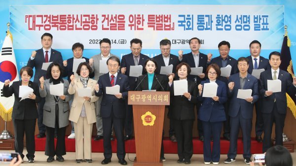 대구시의회는 성명서를 통해 “대구경북신공항은 지방 소멸의 위기를 극복하고 지역의 글로벌경쟁력을 획기적으로 개선하려는 대구·경북의 숙원사업으로, 이번 특별법의 국회 통과는 신공항 건설을 위한 지금까지의 과정 중 이전부지 선정과 군위군 대구편입과 함께 가장 진일보한 성과”라고 평가했다.
