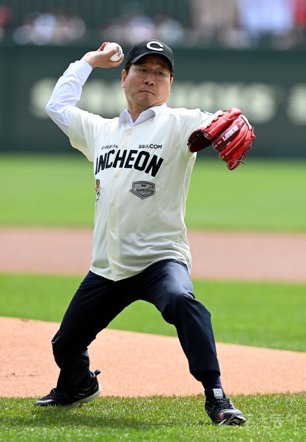 16일 인천 SSG 랜더스필드에서 ‘2023 신한은행 SOL KBO리그’ SSG 랜더스와 NC 다이노스의 경기가 열렸다. 유정복 인천시장이 시구를 던지고 있다.