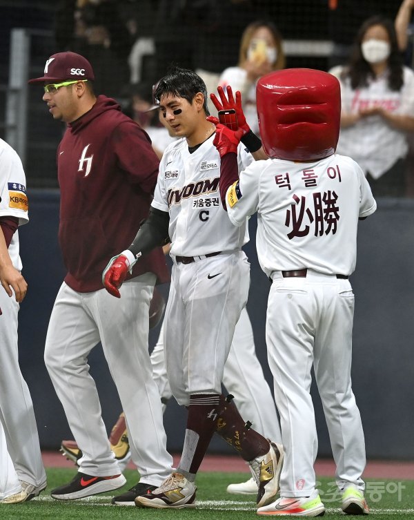 16일 서울 고척스카이돔에서 ‘2023 신한은행 SOL KBO리그’ KIA 타이거즈와 키움 히어로즈 경기가 열렸다. 연장 10회말 1사 1루 키움 이정후가 끝내기 홈런을 날리고 그라운드를 돌아 홈인해 축하를 받고 있다.