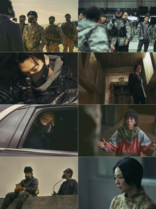 이번에 공개된 스틸은 모두가 선망하는 택배기사 5-8을 비롯해 류석, 사월, 설아가 마스크를 써야만 살아갈 수 있는 세상을 살아가는 모습을 담았다. 먼저 김우빈이 연기한 5-8은 산소를 공급하며 이 세상을 지배하려고 하는 천명그룹에 속한 택배기사로 낮에는 생존을 위한 산소와 생필품을 전달하고, 밤에는 세상의 질서를 바꾸려는 기사(Knight)로 변해 천명그룹의 비밀에 파고드는 인물이다.