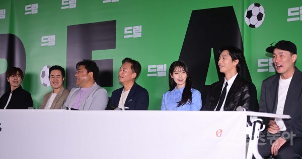 배우 이현우, 정승길, 고창석, 김종수, 아이유, 박서준, 감독 이병헌이 17일 서울 강남구 삼성동 메가박스 코엑스점에서 열린 영화 ‘드림’ 언론시사회에서 취재진의 질문에 웃고 있다.