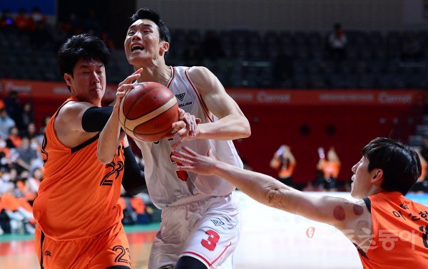 17일 경기도 고양체육관에서 열린 ‘2022-2023 SKT 에이닷 프로농구’ 고양 캐롯과 안양 KGC의 4강 플레이오프 경기에서 KGC 정준원이 캐롯 전성현과 이정현 수비 사이로 슛을 시도하고 있다.