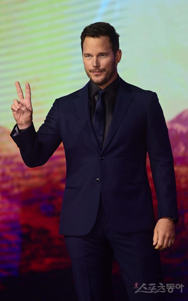 배우 크리스 프랫이 18일 서울 영등포구 여의도동 콘래드 서울에서 열린 ‘가디언즈 오브 갤럭시: Volume 3‘ 내한 기자간담회에서 포즈를 취하고 있다.