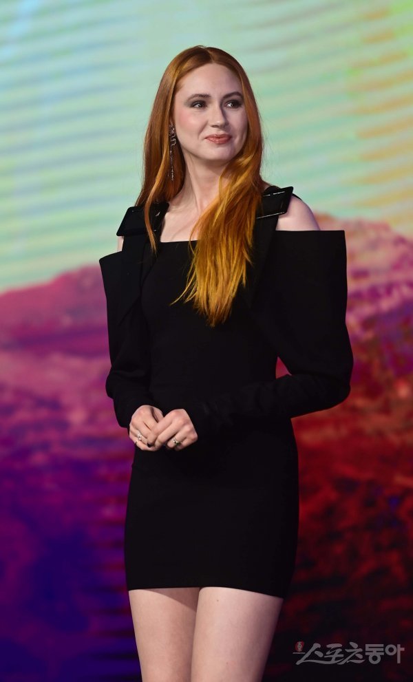 배우 카렌 길런이 18일 서울 영등포구 여의도동 콘래드 서울에서 열린 ‘가디언즈 오브 갤럭시: Volume 3‘ 내한 기자간담회에서 포즈를 취하고 있다.