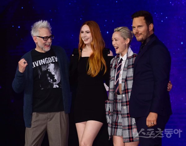 감독 제임스 건, 배우 카렌 길런, 폼 클레멘티에프, 크리스 프랫이 18일 서울 영등포구 여의도동 콘래드 서울에서 열린 ‘가디언즈 오브 갤럭시: Volume 3‘ 내한 기자간담회에서 포즈를 취하고 있다.