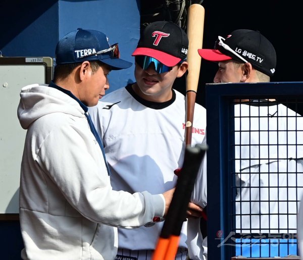18일 서울 잠실야구장에서 열린 ‘2023 신한은행 SOL KBO리그’ LG 트윈스와 NC 다이노스의 경기에 앞서 NC 송지만 코치가 LG 김민성, 서건창과 이야기를 하고 있다.
