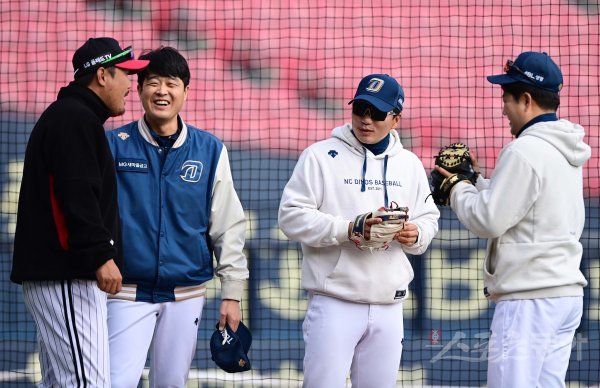 18일 서울 잠실야구장에서 열린 ‘2023 신한은행 SOL KBO리그’ LG 트윈스와 NC 다이노스의 경기에 앞서 LG 이호준, NC 김수경, 이종욱 코치가 이야기를 하고 있다.