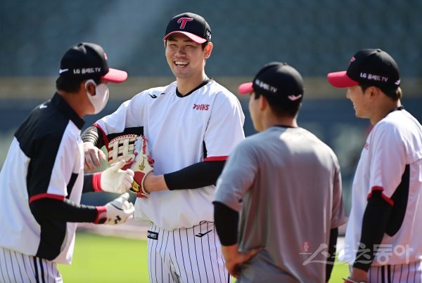 18일 서울 잠실야구장에서 열린 ‘2023 신한은행 SOL KBO리그’ LG 트윈스와 NC 다이노스의 경기에 앞서 LG 홍창기가 코치의 이야기에 웃고 있다.