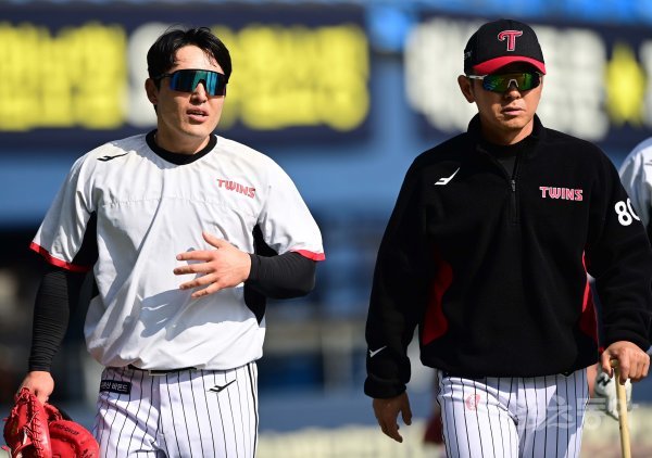18일 서울 잠실야구장에서 열린 ‘2023 신한은행 SOL KBO리그’ LG 트윈스와 NC 다이노스의 경기에 앞서 LG 박동원, 박경완 코치가 훈련을 마친 후 이야기를 하고 있다.