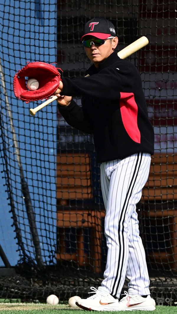 18일 서울 잠실야구장에서 열린 ‘2023 신한은행 SOL KBO리그’ LG 트윈스와 NC 다이노스의 경기에 앞서 LG 박경완 코치가 선수들의 훈련을 위해 포수 미트와 펑고 배트를 들고 있다.