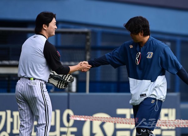 18일 서울 잠실야구장에서 열린 ‘2023 신한은행 SOL KBO리그’ LG 트윈스와 NC 다이노스의 경기에 앞서 LG 고우석이 NC 박석민과 인사하고 있다.