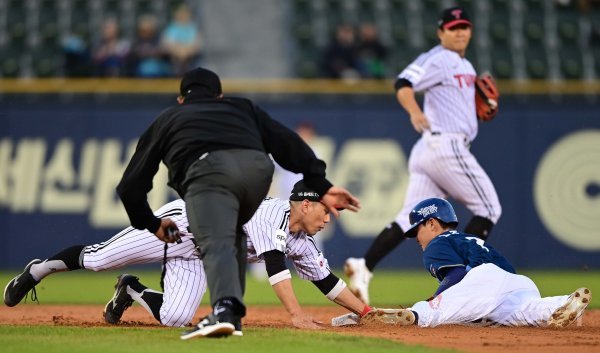 18일 서울 잠실야구장에서 열린 ‘2023 신한은행 SOL KBO리그’ LG 트윈스와 NC 다이노스의 경기에서 2회초 1사 1루 상황에서 LG 2루수 서건창이 NC 1루주자 김주원에게 도루를 허용하고 있다.