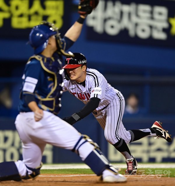 18일 서울 잠실야구장에서 열린 ‘2023 신한은행 SOL KBO리그’ LG 트윈스와 NC 다이노스의 경기에서 3회말 1사 3루 LG의 희생타 때 3루주자 박해민이 홈으로 파고들어 세이프 되고 있다.